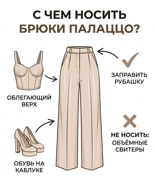 Брюки палаццо сочетаются с облегающим верхом и обувью на каблуке, создавая вытянутый силуэт. Широкий крой от бедра компенсируется приталенным топом, кроп-топом или корсетом. Рубашку к палаццо лучше заправить внутрь, чтобы обозначить линию талии. Объёмные свитеры и худи с палаццо создают эффект бесформенности, поэтому их стоит избегать. Обувь к этому фасону подбирается на каблуке или платформе — туфли-лодочки и босоножки на шпильке визуально вытягивают ноги и не дают ткани волочиться по полу.