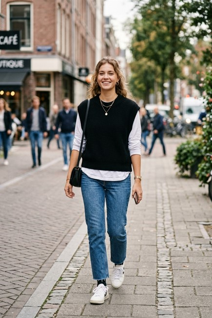 Стиль кэжуал с жилетом строится на расслабленных сочетаниях: джинсовый жилет с клетчатой рубашкой (гранж-направление), вязаный жилет с лонгсливом и широкими карго, костюмный жилет с белой футболкой и джинсами (смарт-кэжуал). Контраст формальностей — приём, который делает повседневный лук нескучным. Строгий жилет в паре с расслабленным денимом работает за счёт столкновения стилистических кодов.