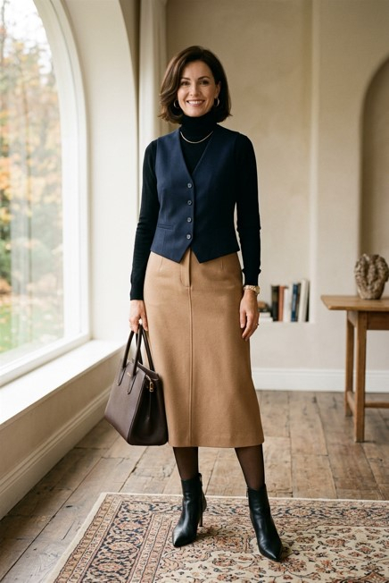 Юбка-карандаш с костюмным жилетом и блузкой — деловой комплект для офиса. Юбка-миди (плиссе, А-силуэт) с вязаным жилетом — комфортный повседневный лук. Мини-юбка с жилетом уместна в неформальном контексте; укороченный жилет здесь создаёт сбалансированные пропорции. Юбка-солнце с трикотажным жилетом — вариант для тёплого сезона с акцентом на лёгкость.
