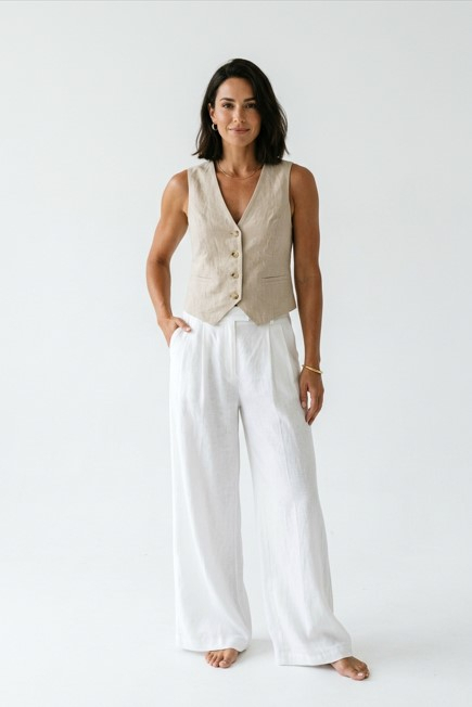 Жилет на голое тело — приём, который превращает безрукавку в самостоятельный верх. Подходят модели из плотной ткани (лён, хлопок, костюмная шерсть) с застёжкой на пуговицы или запахом, обеспечивающие посадку без смещения. Этот вариант работает летом и в тёплом помещении. Жилет вместо топа сочетается с широкими брюками, юбкой-миди и джинсами. Кроп-жилет в такой стилизации акцентирует линию талии.