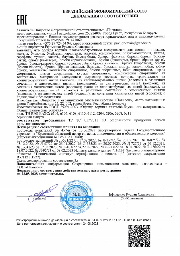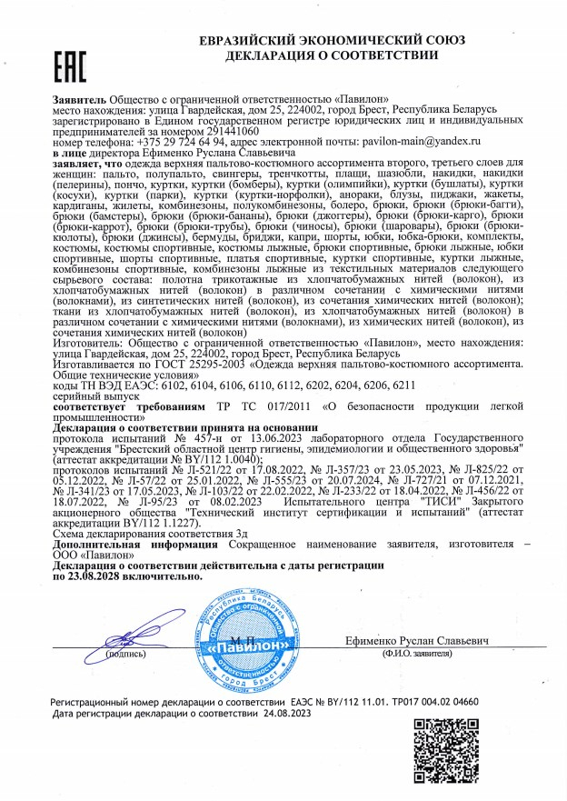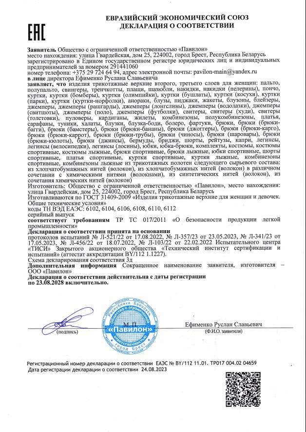 Качество одежды, представленной на сайте, подтверждено Декларацией соответствия Таможенного союза. Этот документ даёт право на реализацию товара на территории России, Беларуси, Казахстана, Армении, Киргизии без дополнительных проверок внутри страны. Наличие Декларации соответствия ТС делает процесс выхода товара на рынок максимально удобным и быстрым.