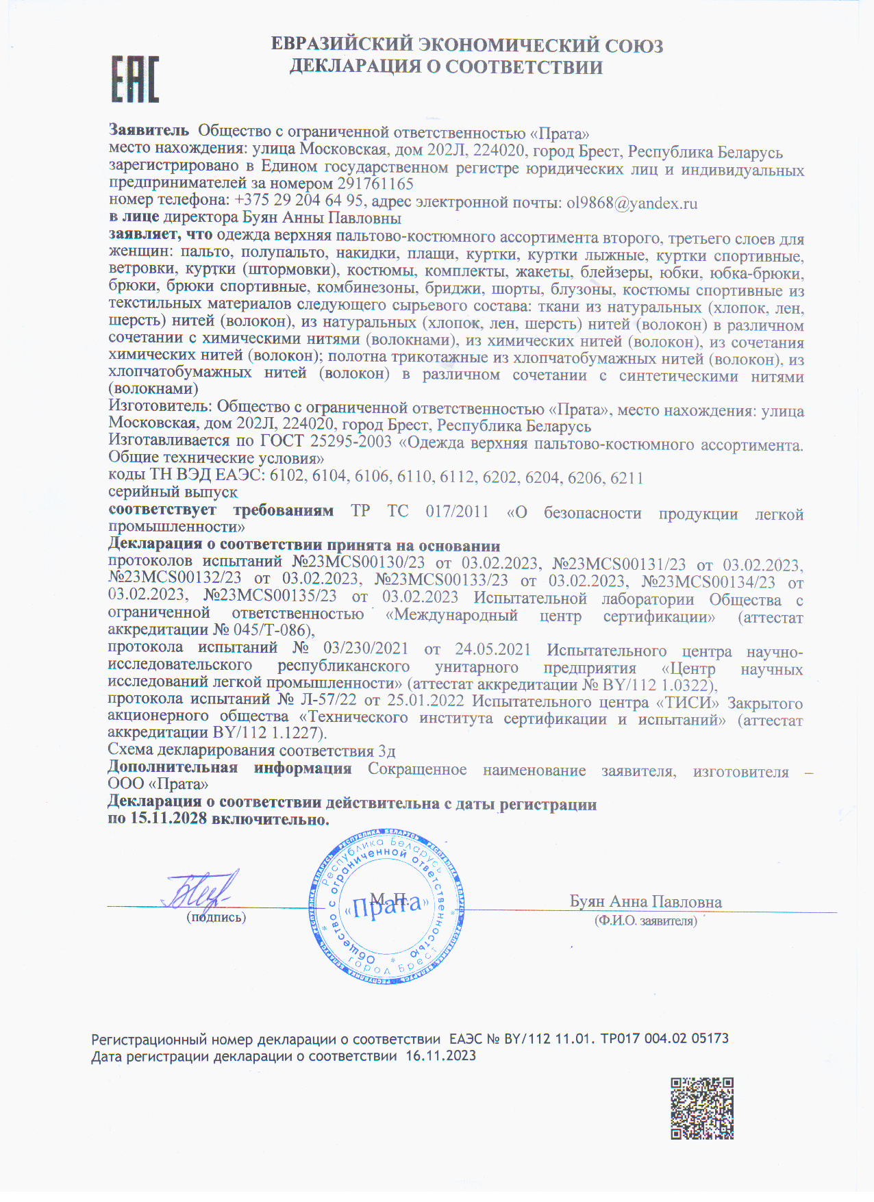 Качество одежды, представленной на сайте, подтверждено Декларацией соответствия Таможенного союза. Этот документ даёт право на реализацию товара на территории России, Беларуси, Казахстана, Армении, Киргизии без дополнительных проверок внутри страны. Наличие Декларации соответствия ТС делает процесс выхода товара на рынок максимально удобным и быстрым.