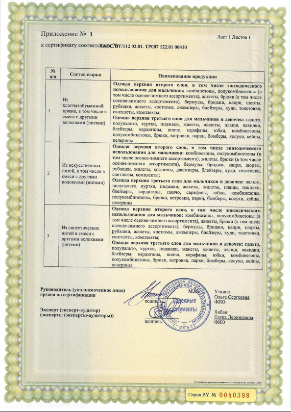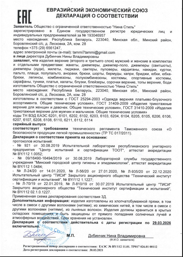 Качество одежды, представленной на сайте, подтверждено Декларацией соответствия Таможенного союза. Этот документ даёт право на реализацию товара на территории России, Беларуси, Казахстана, Армении, Киргизии без дополнительных проверок внутри страны. Наличие Декларации соответствия ТС делает процесс выхода товара на рынок максимально удобным и быстрым.