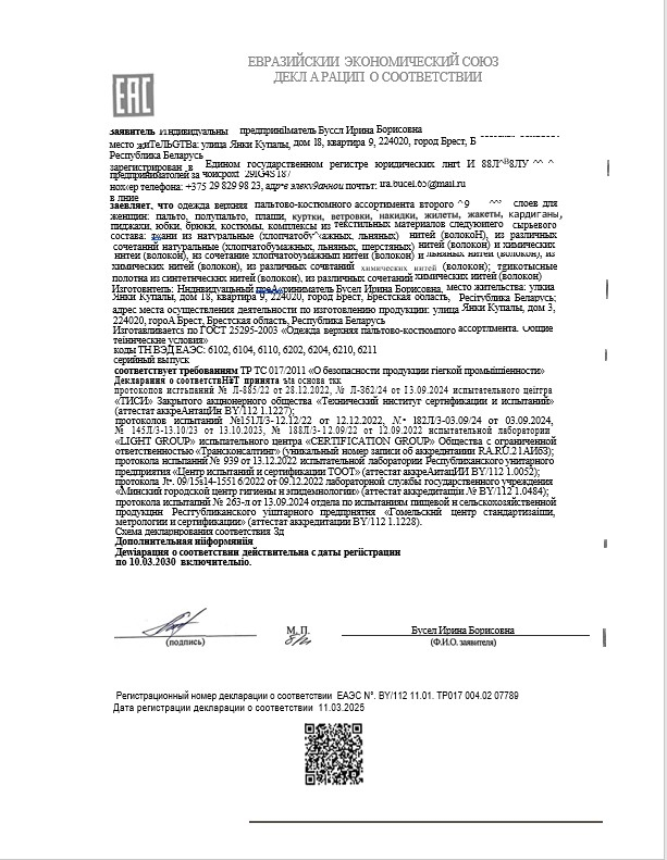 Качество одежды, представленной на сайте, подтверждено Декларацией соответствия Таможенного союза. Этот документ даёт право на реализацию товара на территории России, Беларуси, Казахстана, Армении, Киргизии без дополнительных проверок внутри страны. Наличие Декларации соответствия ТС делает процесс выхода товара на рынок максимально удобным и быстрым.