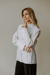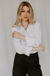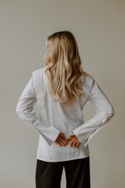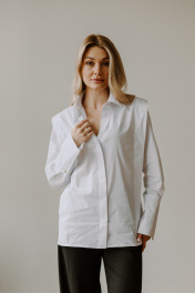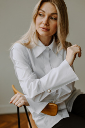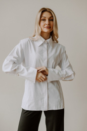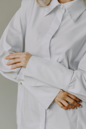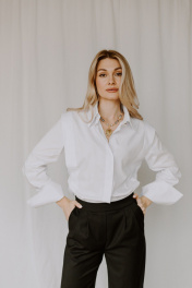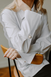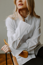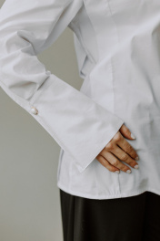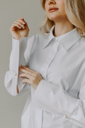 Женская блузка рубашка офисная с длинным рукавом и манжетой клеш — универсальный выбор для гардероба современной женщины. Модель выполнена в классическом стиле, идеально подходящем как для делового образа, так и для повседневных задач. Отложной воротник придает изделию строгий и аккуратный вид, а удлиненный крой создает изящный силуэт. Длинная манжета клеш с перламутровой пуговицей добавляет нотку тренда и выделяет эту вещь среди базовых моделей. Однотонный белый цвет обеспечивает легкость сочетания с любым пиджаком или жакетом. Материал содержит полиэстер, эластан и хлопок, что делает ткань легкой, приятной к телу, устойчивой к сминанию. Благодаря этому блузка сохраняет опрятный внешний вид даже при активном ритме жизни. Классика жанра – сочетание с юбкой-карандашом либо строгими брюками – подчеркнет ваш статус на офисной встрече или деловом мероприятии. Универсальный фасон отлично подходит для большого диапазона размеров: каждая женщина сможет подобрать вариант по фигуре без лишних сложностей. Базовая однотонная модель органично впишется в любой стиль – будь то классический офис или нарядный вечерний выход.