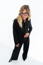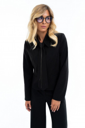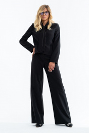 Костюм состоит из жакета, брюк и галстука. Жакет с отложным воротником и застежкой на 4 петли и пуговицы. Жакет на подкладке. По переду функциональные карманы и отрезные бочки. Спинка с рельефами и хлястиком по талии. Брюки прямые от бедра на поясе. Галстук съемный с декоративной цепью. Длина жакета 53 см, длина рукава 60 см, длина брюк 103 см