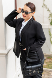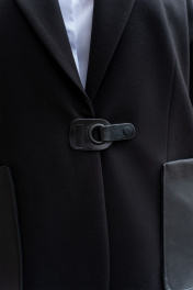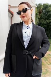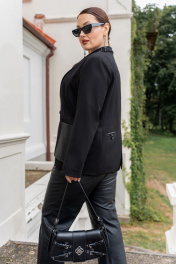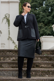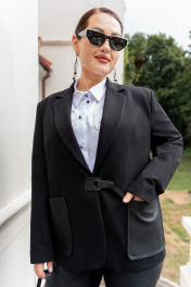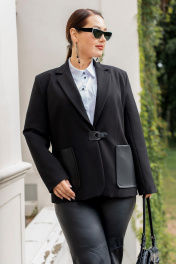 Жакет женский прямого силуэта с V- вырезом горловины, с воротником пиджачного типа, на подкладке. Полочка с накладными карманами, с центральной бортовой застёжкой на "клеванту". Спинка асиметричная с декоративным карманом "в рамку". Жакет с плечевыми накладками. Жакет с втачными двухщовными рукавами. Жакет на подкладке.