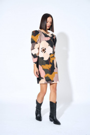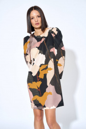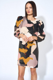 Платье из плательной ткани, прямого силуэта, с застежкой на потайную тесьму-молнию, расположенную в среднем шве спинки платья. Перед с нагрудными вытачками из бокового шва, спинка со средним швом. Рукава втачные, одношовные, 7/8 длинной, с односторонними и одной встречной складками.
