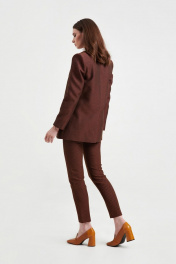 Жакет из костюмно-плательной ткани, прямого силуэта, со смещенной бортовой застежкой на две петли и пуговицы. На правой части переда соответственно расположению петель пришиты отделочные пуговицы. Петля левой части переда застегивается на пуговицу, пришитую со стороны подборта правой части переда. Перед с нагрудными вытачками из бокового шва, прорезными карманами с клапаном и двумя обтачками. Спинка со средним швом, плечевыми вытачками, средний шов заканчиваются открытой шлицей. Рукава втачные, двухшовные, длинные. Воротник отложной с отворотами из подбортов. Жакет на подкладке с плечевыми накладками.