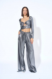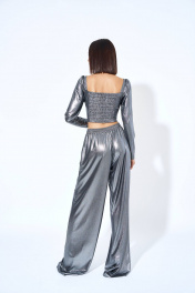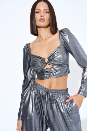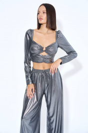 Джемпер женский, из трикотажного полотна, полуприлегающего силуэта, короткий. Перед состоит из двух частей, в верхнюю часть переда по центру продето кольцо, нижняя часть переда присборена. Спинка с вертикальными рельефами, центральная часть спинки с отделочными строчками, в ячейки которой продета эластичная тесьма. Рукава втачные, одношовные, длинные, окат рукава со сборкой, притачной кулисой, в кулису продета эластичная тесьма.