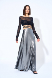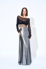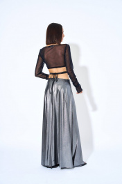 Блузка женская из блузочной ткани, полуприлегающего силуэта, короткая. Перед состоит из двух частей, верхняя часть переда присборена по боковым швам и центру. Рукава втачные, одношовные, длинные, присборены по шву. Горловина переда и спинки круглая. Горловина переда и спинки, низ рукава, верхний срез переда – окантованны.