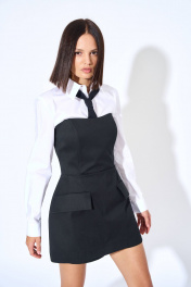 Комбинезон женский из костюмно-плательной ткани, полуприлегающего силуэта, отрезной по линии талии, с застежкой на потайную тесьму - молнию, расположенную в среднем шве спинки. Верхняя часть переда с вертикальными рельефами, талевыми вытачками. Верхняя часть спинки с вертикальными рельефами. Нижняя часть переда и спинки комбинезона с талевыми вытачками, нижняя часть переда с клапанами. Передние и задние части шорт комбинезона с талевыми вытачками. Комбинезон на подкладке.