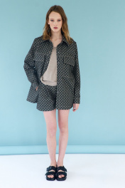 Шорты женские из костюмной ткани, прямые, на талии, на притачном поясе, пояс с пятью шлевками. Застежка шорт в верхней части среднего шва передних частей на тесьму-молнию, петлю и пуговицу по концам пояса. Передние части шорт с односторонними складками, сгиб которых направлен к боковому шву, с боковыми карманами, обработанными в швах отрезных бочков. Задние части шорт с отрезной кокеткой.