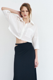 Блузка женская, из плательной ткани, прямого силуэта, короткая, застежка по переду сверху до низа блузки, на цельнокроенную планку, планка застегивается на пять петель и пуговиц. Перед цельнокроеный с передними частями рукавов, с накладным карманом на левой части переда. Спинка цельнокроенная с локтевыми частями рукавов. Рукава цельнокроеные, одношовные, длинной ¾. Воротник отложной с отрезной стойкой, стойка с застежкой на петлю и пуговицу.