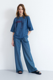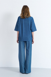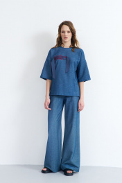 "Джемпер женский из трикотажного полотна, прямого силуэта, со спущенной линией плеча, короткий. Перед джемпера с декоративной вышивкой. Рукава втачные, одношовные, длинной 3/4. Горловина переда и спинки круглая, с притачной бейкой."