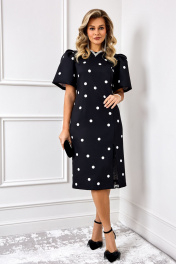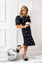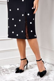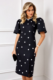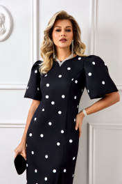 Роскошное нарядное платье, выполнено из плательной ткани Барби с добавлением вискозы с модным принтом горох. Платье с объемными рукава, что придает модели особый стиль и шарм. Платье прилегающего силуэта, вырез горловины округлый, по переду с разрезом и декорировано кружевом. По спинке платья потайная молния застежка. Модель прекрасно подойдет для торжественного мероприятия!