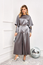 Элегантный и нарядный комплект, состоит из блузы и брюк. Изящная блуза прямого силуэта, выполнена из высококачественной ткани Твист с добавлением вискозы. Горловина блузы с округлым вырезом, по низу, по бокам, с небольшими разрезами. Рукав втачной, снизу с манжетой и застежкой на пуговицу. По спинке блуза с небольшим разрезом-капелькой и застежкой на пуговицу. Брюки прямые, выполнены из высококачественной ткани Твист с добавлением вискозы, по переду и спинке со складками, что придает модели особый шарм и нарядность. Пояс брюк по спинке с резинкой и застежкой сбоку на потайную молнию и пуговицу. Модель прекрасно подойдет для торжественного мероприятия и ежедневной носки. В комплект входит пояс-цепочка серебристого цвета, для придания образу еще большей нарядности и стильности.
