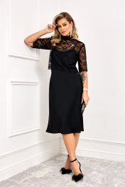 Элегантный и нарядный комплект, состоит из блузы и платья. Блуза выполнена из французского кружева высочайшего качества. Блуза прямого силуэта, с втачным рукавом. Горловина блузы со стойкой и вырезом-капелькой, с застежкой на пуговицы. Блуза декорирована съемной дизайнерской булавкой серебристого цвета, что придает модели особый шарм. Платье-комбинация А-силуэта, выполнена из атласной ткани с добавлением вискозы. Модель прекрасно подойдет для торжественного мероприятия и ежедневной носки.