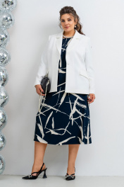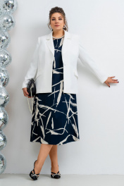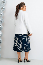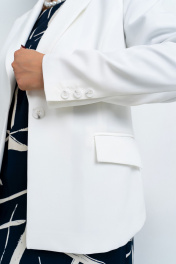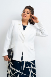 Жакет слегка притален, удлиненный, с центральной застежкой на 1 петлю и пуговицу, с воротником пиджачного типа. Низ бортов прямой. По переду бочек и функциональные карманы с клапаном. Спинка со средним швом без особенностей. Рукава втачные, двухшовные декорированные пуговицами и шлицей. Изделие на подкладке хорошо держит форму. Длина жакета 68 см, длина рукава 60 см.