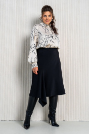 Универсальная блузка-рубашка прямого силуэта с необычным контрастным принтом, в котором Вы будете чувствовать себя неотразимой. Блузка прямого силуэта с центральной застёжкой на потайную планку с пуговицами. Вырез горловины оформлен отложным воротником со стойкой. Спинка без особенностей. Линия плеча слегка спущеная. Рукав втачной длинный с манжетой по низу. Застежка манжеты на 2-е петли и пуговицы. Длина блузки 75 см, блина рукава от горловины 82см.