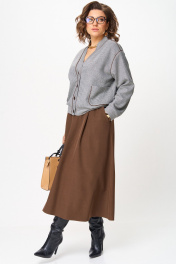 - ОписаниеЭтот костюм — воплощение интеллектуальной элегантности. Мягкий светло-серый кардиган с коричневыми кантами и крупными пуговицами создаёт образ уютного шарма. V-образный вырез визуально вытягивает шею, а контрастные детали подчёркивают чёткость линий. Рукав на спущенной плойме и манжетой по низу. По перду накладные карманы с декоративной нашивкой. Коричневая юбка миди с глубокими встречными складками и разрезом по переду добавляет образу женственности. В боковых швах карманы. Юбка на подкладке. Для максимально комфортной посадки по бокам пояса вставлена эластичная резинка. Сочетание мягкого верха и строгого низа создаёт баланс между комфортом и аккуратностью, делая комплект универсальным для офиса, повседневных выходов и стильных деловых встреч.