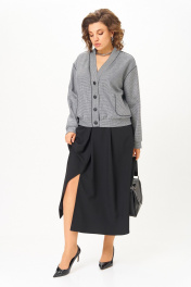 Этот костюм — воплощение интеллектуальной элегантности. Мягкий светло-серый кардиган с коричневыми кантами и крупными пуговицами создаёт образ уютного шарма. V-образный вырез визуально вытягивает шею, а контрастные детали подчёркивают чёткость линий. Рукав на спущенной плойме и манжетой по низу. По перду накладные карманы с декоративной нашивкой. Коричневая юбка миди с глубокими встречными складками и разрезом по переду добавляет образу женственности. В боковых швах карманы. Юбка на подкладке. Для максимально комфортной посадки по бокам пояса вставлена эластичная резинка. Сочетание мягкого верха и строгого низа создаёт баланс между комфортом и аккуратностью, делая комплект универсальным для офиса, повседневных выходов и стильных деловых встреч.