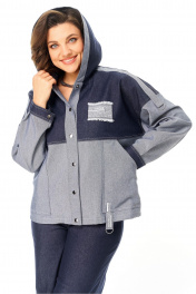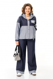 Тренд сезона, брючный джинсовый костюм. Жакет курточного типа комбинированный с капюшоном. Рукав на спущенной пройме с расстёгивающейся манжетой по низу. По переду накладные карманы и кокетка. Застежка центральная на кнопки. Спинка без особенностей. По низу кулиса. Брюки, прямые от бедра с широкой манжетой по низу. По переду вблизи боковых швов карманы. Для максимально комфортной посадки по поясу вставлена эластичная резинка. Длина жакета 65 см, длина рукава от горловины 75 см, длина брюк 109 см.