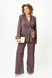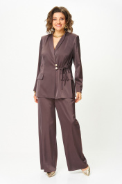 - ОписаниеИзысканный костюм, воплощающий элегантность и уверенность. Мягкий сатиновый блеск ткани придаёт образу утончённый вечерний шарм, а глубокий сливочно-шоколадный оттенок создаёт впечатление благородного спокойствия и сдержанной роскоши. Жакет с запахом и акцентом на талию формирует женственный силуэт и визуально вытягивает фигуру. Застежка на две нависные петли и золотистые пуговицы с декоративной завязкой по левой части переда добавляет нотки гламура. По переду талевые вытачки и накладные клапаны. Воротник шалевый с небольшой стой. Рукав втачной двухшовный с разрезом по низу. Брюки широкие с мягкими складками по переду и боковыми карманами вблизи боковых швов, подчёркивают лёгкость и свободу движения. Для максимально комфортной посадки по поясу вставлена эластичная резинка по спинке и бокам. Этот костюм идеально подойдёт для особых случаев, деловых встреч или вечерних выходов.