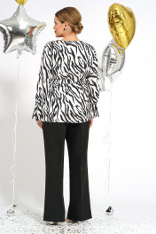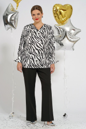 Комплект женский 2-х предметный состоящий из блузы и брюк. Блуза прямого силуэта, с завязывающим поясом, по боковым швам разрезы. Перед с нагрудными выточками. Рукава втачные, длинные, верхний шов книзу заканчивается разрезом, по боковым швам разрезы, со сборкой и широкими притачными манжетами, на петлю и пуговицу. Горловина V- образной формы с притачными планками. Блуза декорирована отделочным кантом по планке горловины переда, по верхнему шву рукава. Брюки длинные, типа «клёш» прилегающие по бёдрам и от линии колена идут на расширение, со сгибом, на поясе, с застежкой в среднем шве типа «гульфик» на тесьму-молнию и по поясу на петлю и пуговицу. Задние части с талевыми вытачками.