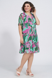 Платье женское силуэта А- образной формы, на подкладке, ниже линии талии, понизу с двумя притачными оборками разной ширины по шву соединения собраны на сборку. С застёжкой по притачной планке на петли и пуговицы. Перед с нагруными выточками. Рукава втачные, одношовные, короткие.