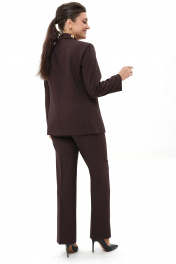 Жакет полуприлегающего силуэта, частично на подкладке (перед, спинка), с центральной застёжкой на петли, пуговицы. Декорированный съёмным украшением. Перед с отложными лацканами, с рельефными швами, отрезным бочком, прорезными карманами с двумя обтачками. Спинка со средним швом. Рукава втачные, двухшовные, длинные, в локтевой шве шлица декорированная пуговицами. Воротник пиджачного типа. Брюки длинные, типа «клёш» прилегающего силуэта по бёдрам и от линии колена идут на расширение, со сгибом, на притачном поясе, застежка типа «гульфик» на тесьму-молнию, петлю и пуговицу по поясу. Задние части с талевыми выточками.