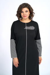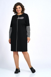 Платье прямого силуэта, с застёжкой по среднему шву спинки на потайную тесьму-молнию в среднем шве спинки, со спущенной линией плеча. Перед со средним швом по шву отделочная тесьма. Рукава втачные, длинные. Платье декорировано по переду термоаппликцией.