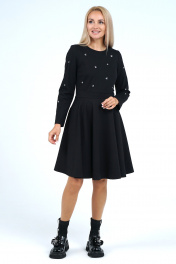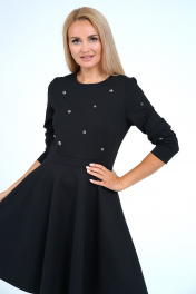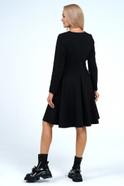 Платье полуприлегающего силуэта верху с расширением книзу отрезное по линии талии, с застёжкой по среднему шву спинки на потайную молнию. Перед с нагрудными выточками, по линии талии с притачным поясом фигурной формы. Рукава втачные, одношовные, длинные. Декорировано по лифу переда рукавам пришивными бусинами формы «сердечка».