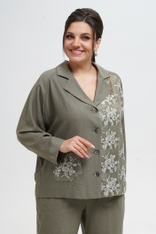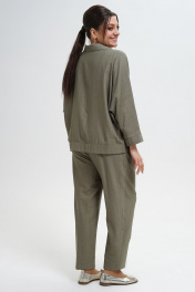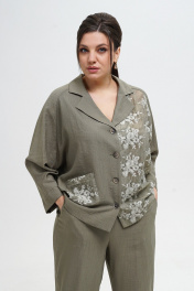 Жакет женский прямого, свободного силуэта понизу спинки степень прилегания фиксирует резинка, с застёжкой на петли, пуговицы. Левая часть переда и накладной карман выполнены из отделочной ткани «шитьё». Перед с отложными лацканами, с накладным карманом по правой части. Рукава цельнокроеные со спинкой по переду переходящий в реглан, длиной ¾, понизу с притачными манжетами. Воротник отложной с отворотом. Брюки типа «банан», с притачным поясом на резинке. Передние части с косыми боковыми карманами, по центру от низа конструктивная выточка.