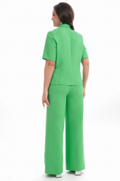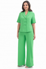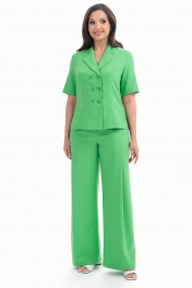 Жакет полуприлегающего силуэта, с двухбортной застёжкой на петли, пугови и с внутренней застёжкой на петлю, пуговицу. Перед с отложными лацканами, с рельефными швами. Спинка со средним швом и рельефными швами. Рукава втачные, одношовные, короткие. Воротник небольшая шалька, входящая в лацкан. Брюки полуприлегающие по бёдрам и талии, книзу расширенные, на притачном поясе (Р52-56 по боковым пояса на резинке), застёжка типа «гульфик» по среднему шву переда на молнию и петлю, пуговицу по поясу. Передние части с мягкой застроченной складкой от линии талии и чуть ниже линии бёдер. Задние части с талевыми выточками.