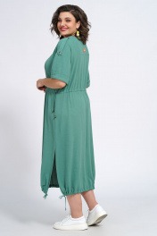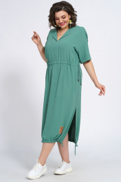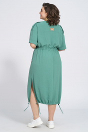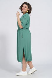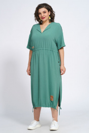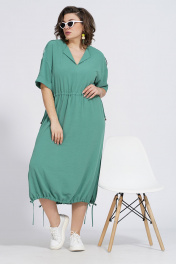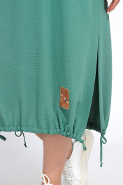 Платье прямого, свободного силуэта, отрезное по линии талии с кулисой, со спущенной линией плеча и патами фиксируемые на петлю и пуговицу посередине шва. Степень прилегания по линии талии и низ фиксируется окантовочный шнуром. Перед верху со средним швом и отложными лацканами. Спинка верху с рельефными швами и конструктивным горизонтальным подрезом декорированная нашивкой, нижняя часть со средним швом. Рукава втачные, короткие, одношовные понизу с притачными отложными манжетами.