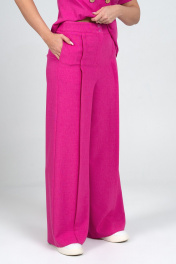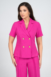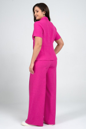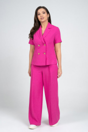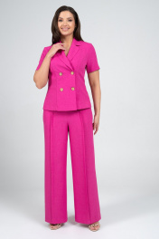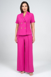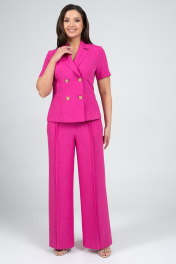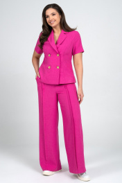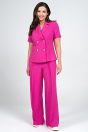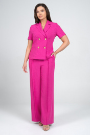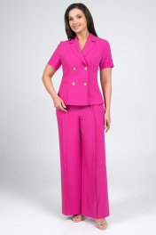 Жакет полуприлегающего силуэта, с двух-бортной застёжкой на петли, пуговицу и с внутренней застёжкой на потайную петлю и пуговицу. Перед с отложными лацканами, с рельефными швами. Спинка со средним швом и рельефными швами. Рукава втачные, одношовные, короткие. Воротник отложной с отворотом. Брюки прямого силуэта, на притачном поясе со шлёвками, с застёжкой типа «гульфик» на молнию и по краю пояса на петли, пуговицы, в боковых швах карманы. Передние части по сгибу с отстроченными складками. Задние части с талевыми выточками.