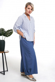 Комплект женский 2-х предметный состоит из жакета и брюк. Жакет прямого, свободного силуэта, с застёжкой на петли, пуговицы, со спущенной линией плеча, по боковым с разрезами и декоративными клапанами. Перед с отложными лацканами. Рукава втачные, одношовные, длиной 3/4 с патами фиксируемые длину рукава на петлю, пуговицу. Воротник отложной с отворотом. Брюки широкие, свободные, длинные, с притачным поясом по спинке на резинке, с отрезными боковыми частями понизу с мягкими встречными складками. Передние части с застроченными мягкими складками от верха и косыми боковыми карманами.