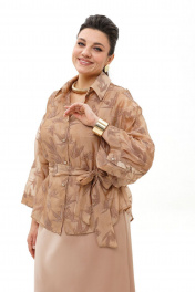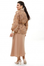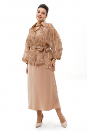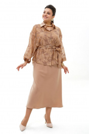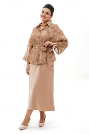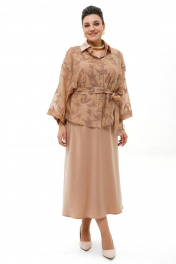Комплект женский 2-х предметный состоит из блузки и платья. Блузка прямого, свободного силуэта, с завязывающимся поясом, с застёжкой на петли, пуговицы, с разно-уровневым низом (спинка длиннее переда). Спинка с притачной кокеткой и бантовой складкой. Рукава втачные, одношовные, длиной ¾, понизу вдоль разреза планка, мягкие складки и притачные манжеты, застёгивающиеся на петли, пуговицы. Платье полуприлегающего силуэта вверху книзу типа «рыбки», раскроено по косой. Перед с нагрудными выточками.