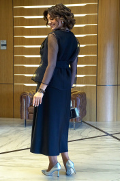 Комплект женский 2-х предметный состоит из блузона и платья. Блузон прямого, свободного силуэта, без застёжки на запах, с завязывающимся поясом. Перед с отложными лацканами. Спинка со средним швом. Рукава втачные, одношовные, длиной ¾. Платье полуприлегающего силуэта вверху книзу типа «рыбки», раскроено по косой. Перед с нагрудными выточками.