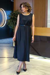 Комплект женский 2-х предметный состоит из блузона и платья. Блузон свободного силуэта, на подкладке, со спущенной линией плеча, без застёжки, с ремнём, с фигурной линией низа, с отлетными боковыми швами. Перед с имитацией воротника апаш. Спинка со средним швом понизу формы «баллон». Платье полуприлегающего силуэта вверху книзу типа «рыбки» раскроено по косой. Перед с нагрудными выточками.