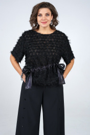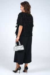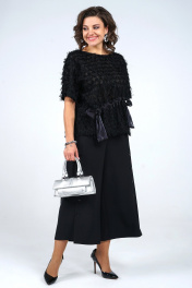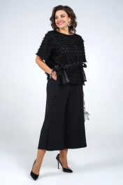 Комплект женский 2-х предметный состоит из блузы и кюлот. Блуза прямого, свободного силуэта, со спущенной линией плеча, с втачными одношовными, короткими рукавами. По переду степень прилегания фиксирует отделочная кулиса с завязкой. Кюлоты полуприлегающие силуэта верху и прямые книзу, на притачном поясе по спинке на резинке, с застёжкой типа «гульфик» на молнию и по поясу на две петли, пуговицы. Со смещёнными боковыми швами на перед, переходящие в шлицу фиксируемая пуговицами, в швах карманы. Задние части с талевыми выточками.