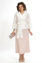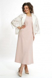 Блузон прямого, свободного силуэта, без застёжки на запах, с завязывающимся поясом. Перед с отложными лацканами. Спинка со средним швом. Рукава втачные, одношовные, длиной ¾. Платье полуприлегающего силуэта вверху книзу типа «рыбки», раскроено по косой. Перед с нагрудными выточками.