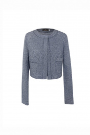 Жакет из трикотажного полотна, полуприлегающего силуэта, короткий. Перед с нагрудными вытачками из бокового шва, накладными карманами, по центру переда притачная планка, планка застегивается на пришивную металлическую кнопку. Спинка прямая. Рукава реглан, двухшовные, длинные, с локтевыми вытачками. Горловина переда и спинки круглая с притачной бейкой.
