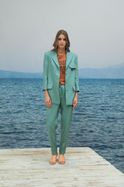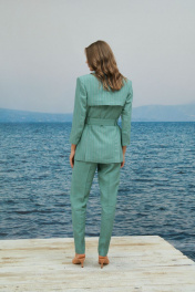 Жакет из костюмно-плательной ткани, полуприлегающего силуэта с центральной бортовой застежкой на три петли и пуговицы. Перед с вертикальными рельефами, от проймы до низа, нагрудными вытачками из рельефного шва, с прорезными карманами с клапаном и двумя обтачками, на левой части переда отлетная кокетка фигурной формы. Спинка с вертикальными рельефами, от проймы до низа, рельефные швы заканчиваются открытыми шлицами, отлетной кокеткой, двумя шлевками. Рукава втачные, двухшовные, длинной ¾, с цельнокроенными манжетами. Воротник отложной с отворотами из подбортов. Жакет на подкладке с плечевыми накладками, со съемным поясом, застегивающимся на пряжку и блочки.