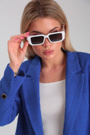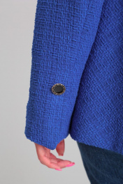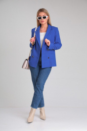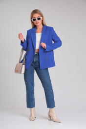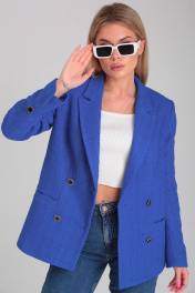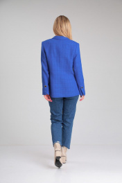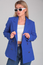Жакет полуприлегающего силуэта с двубортной застежкой на 2 пары петель и пуговиц и воротником пиджачного типа. Перед с талиевыми вытачками, прорезными карманами с листочками и отрезными бочками, спинка со средним швом и отрезными бочками. Рукава втачные двухшовные со шлицами по низу. Жакет на подкладке контрастного цвета.