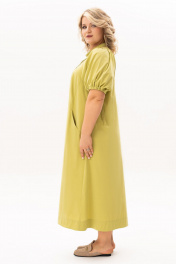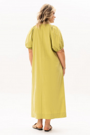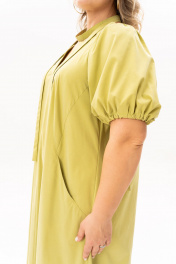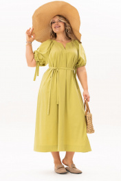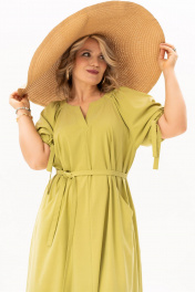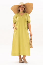 Это летнее платье — идеальное воплощение легкости и современного стиля. Вот подробное описание модели, как на фото: Летнее платье миди в цвете лайм . Силуэт и крой: Платье имеет свободный А-образный крой, который обеспечивает комфорт в жаркую погоду. Длина миди (до середины голени) делает образ элегантным и подходящим для разных случаев. Акцент на талии: в комплекте съемный пояс-завязка из той же ткани. Он позволяет трансформировать образ: можно подчеркнуть фигуру, создав женственный силуэт, или носить платье без него как свободную тунику (оверсайз). Детали лифа: V-образный вырез горловины визуально удлиняет шею. Деликатная сборка у воротника добавляет ткани красивую драпировку. Рукава: Объемные рукава длиной до локтя дополнены кулисками с завязками. Это позволяет регулировать длину и пышность рукава, создавая эффектные «фонарики». Ткань: Материал выглядит натуральным и легким (вероятно, смесовый хлопок или лен), что позволяет коже «дышать». Сочный оливково-лаймовый оттенок идеально подчеркивает летний загар. Длина изделия (см): 130 Длина рукава с плечом (см): 41