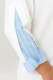 Практичный и удобный – он станет Вашей любимой туникой, а трендовый дизайн делает его актуальным решением для девушек, которые следят за модой. Свитшот женский с имитацией рубашки- новинка коллекции. Изготовленный из качественного трикотажа и полоски на х/б основе, он обеспечивает дышащие свойства и гипоаллергенность, что особенно важно для женщин с чувствительной кожей. Подходит на осень, весну и для зимы. Ткань необычайно мягкая и приятная к телу. Свободный оверсайз крой изумительно подойдет для девушек и женщин больших размеров. На свитшоте обработан воротник и  застежка –планка на петли и пуговицы. Рукав комбинирован из двух тканей, с манжетой и разрезом. Модель подходит для высоких и для невысоких.  Такая модель должна быть в каждом гардеробе. Длина рукава - 62 Длина блузы - 68