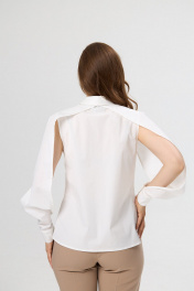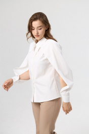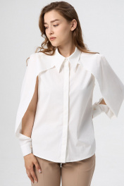 Блузка женская, прямого кроя, выполнена из плательно-блузочной хлопковой смесовой ткани, длиной до линии бёдер. Перед с центральной супатной (потайной) застёжкой на петли и пуговицы. Воротник рубашечный отложной на отрезной стойке. Рукав длинный реглан-кейп распашной на притачной манжете с застёжкой на петлю и пуговицу.