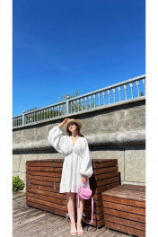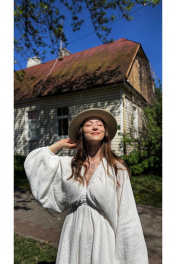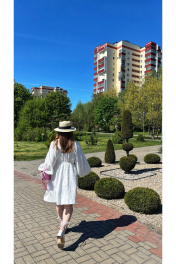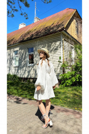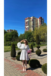 Платье женское из плательно-блузочной хлопковой ткани, длиной чуть выше колена. Приталенное, отрезное и на резинке чуть выше линии талии, с длинным роскошным рукавом-кимоно.Снизу рукав присборен на узенький манжет с резинкой. Лиф с изящным V-образным вырезом с декоративными планками, переходящими и на горловину спинки, в которые вставлена резинка, присбаривающая лиф и позволяющая при желании приспустить платье на плечи. Лиф спинки с рельефами. Юбка платья на хлопковой подкладке со средним швом сзади, выполнена закрытым способом с широкой подгибом по низу.